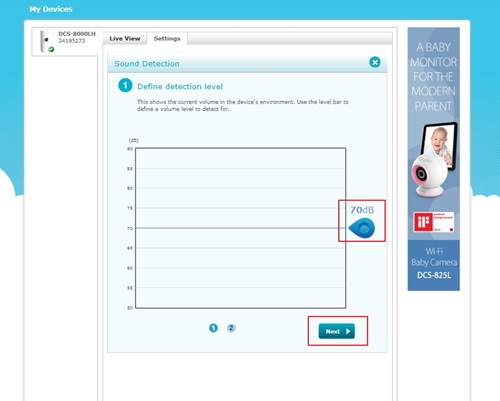 Step 1: Place a Check next to the Enable e-mail notifications box to allow notifications be sent to your mydlink registered e-mail address, and the Sound Detection box to turn sound detection on.