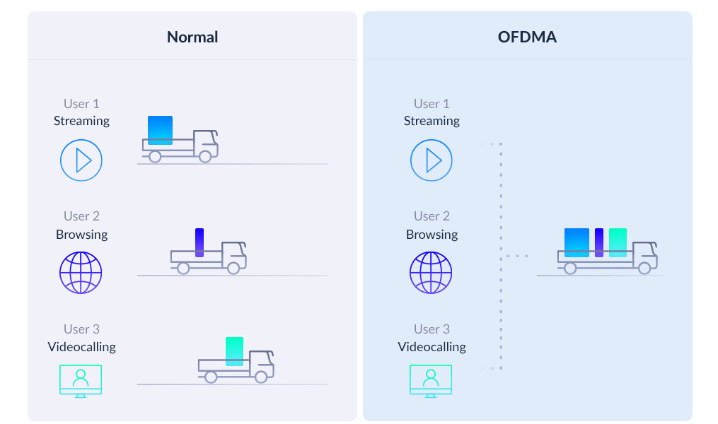 Les petits paquets de données destinés à plusieurs appareils sont transmis ensemble et n’ont plus besoin de faire la queue. Parfait pour les appareils gourmands en bande passante.