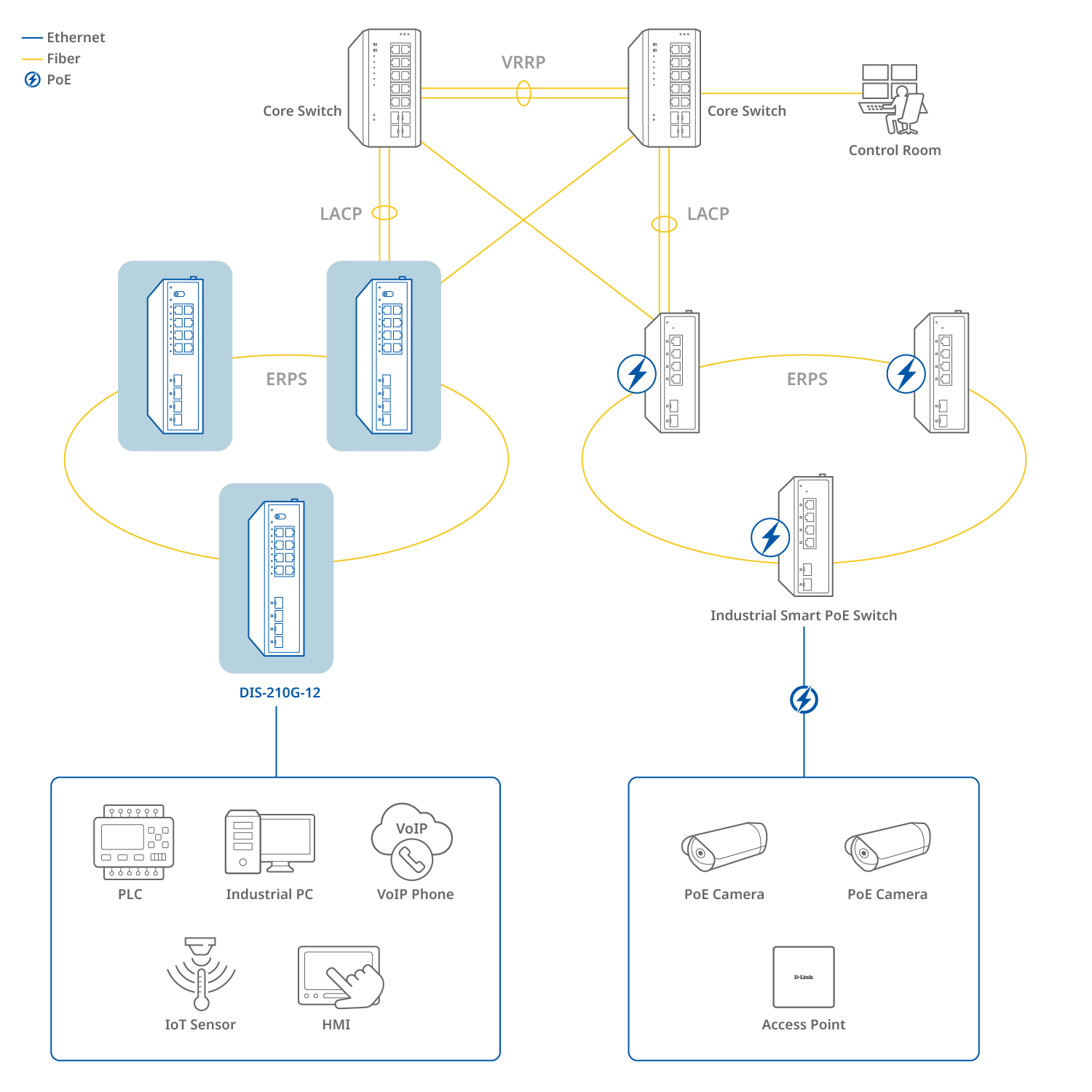 Le DIS-210G-12 est un switch intelligent industriel équipé de huit ports 1G et de quatre ports SFP 1G pour la gestion et l’agrégation du réseau. Les ports SFP prennent en charge la transmission longue distance, la redondance à basculement rapide et l’agrégation du débit. La prise en charge d’ERPS et du routage statique réduit la latence, permet un contrôle efficace du trafic et améliore la scalabilité et l’efficacité du réseau.