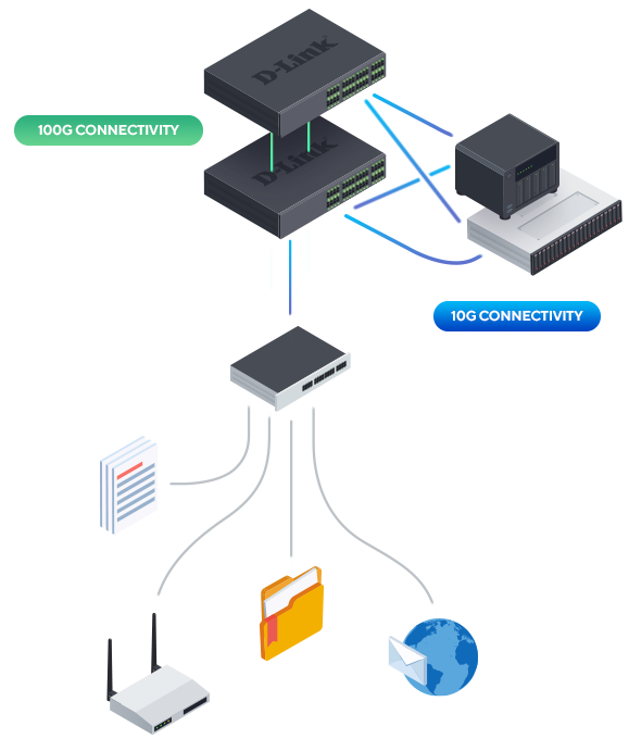 Les switches DXS-3610 offrent des capacités de haute disponibilité telles que l’empilage en anneaux (avec DEM-CB100Q28), l’ERPS et l’agrégation de liens pour fournir une disponibilité fiable à votre réseau d’entreprise.