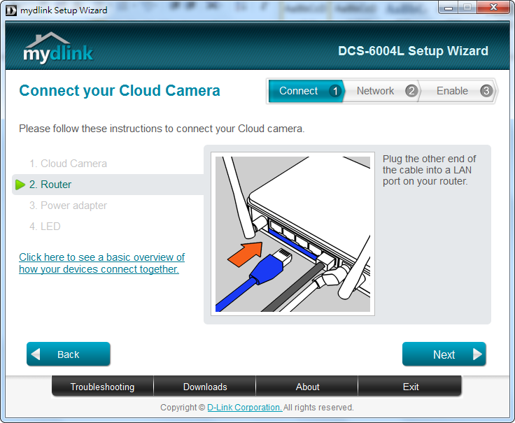 - Step 2.4: Follow the on-screen instructions to connect your camera to your router and connect the power. Click Next after you have completed each step.