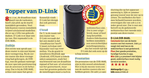 Met de DIR-868L Wireless AC1750 Dual-Band Gigabit Cloud maakt u gebruik van de draadloze technologie van de toekomst en het unieke mydlink™ om eenvoudig verbinding met uw netwerk te maken en het te controleren en bewaken. Als u de gratis mydlink™-app downloadt, kunt u uw thuisnetwerk op afstand bewaken. En de inbegrepen SharePort™-technologie maakt de toegang tot en het delen van uw bestanden, afspeellijsten en video’s eenvoudiger dan ooit.