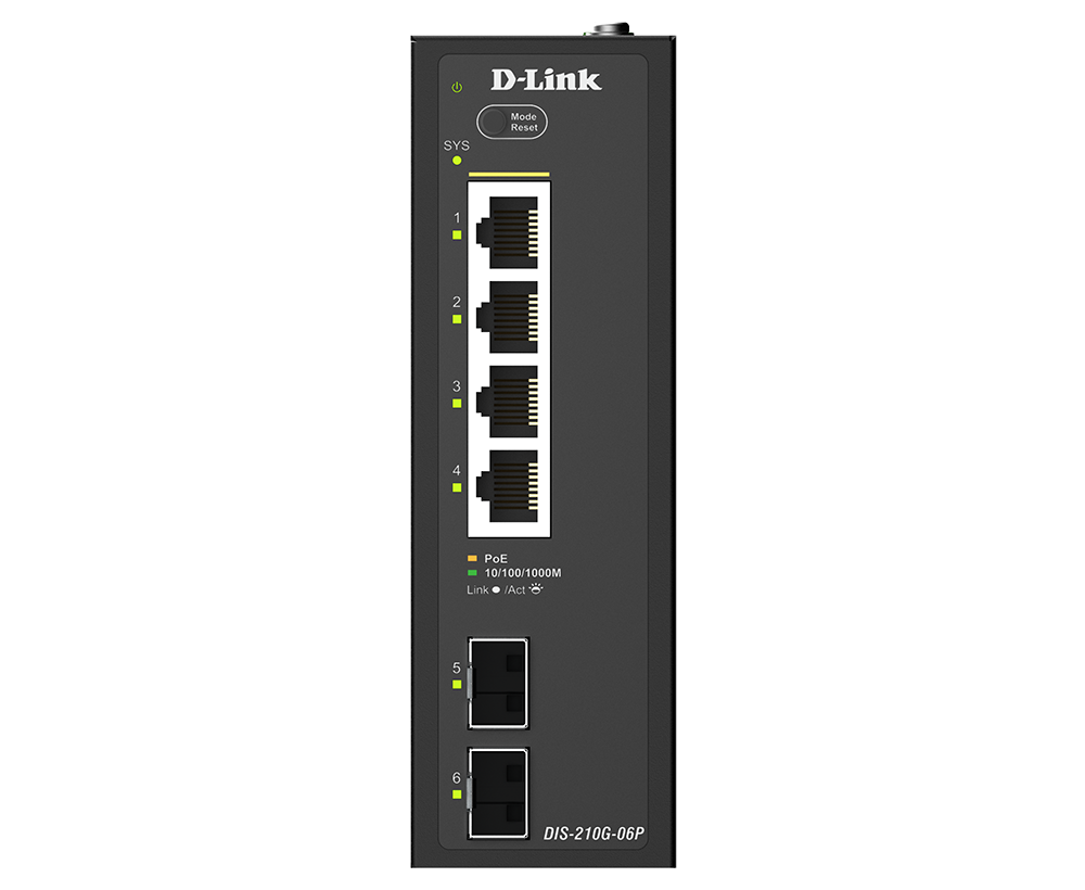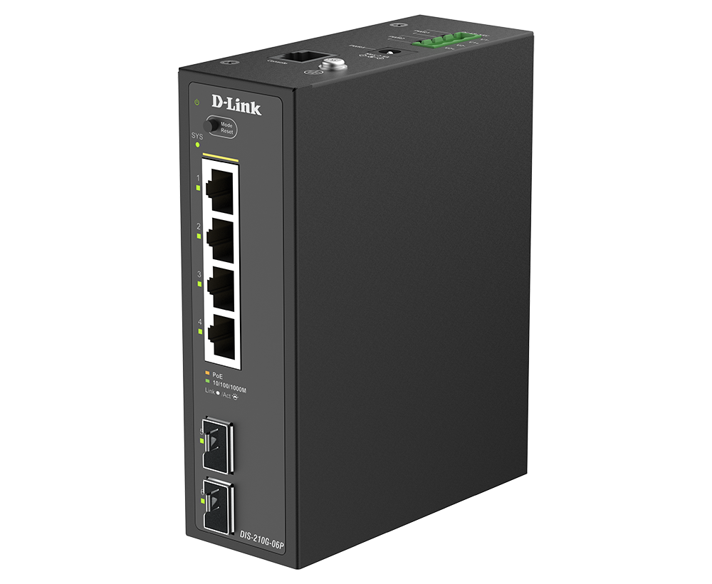 The DIS-210G-06P is an industrial smart switch equipped with four 1G ports and two 1G SFP ports for network management and aggregation. With a total power budget of up to 120W, each port can supply up to 30W. The SFP ports support long-distance data transmission, rapid failover redundancy, and throughput aggregation. The DIS-210G-06P supports ERPS and static routing, which reduces latency, enables effective traffic control, and improves network scalability and efficiency.