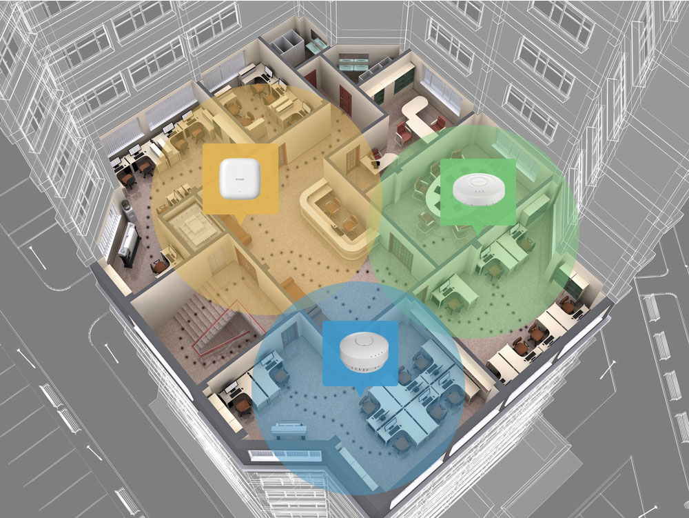 Kombinací DWL-6610AP s bezdrátovým Wi-Fi kontrolérem řady DWC můžete vytvořit bezdrátovou síť, ve které se mohou uživatelé pohybovat po budově bez ztráty konektivity.