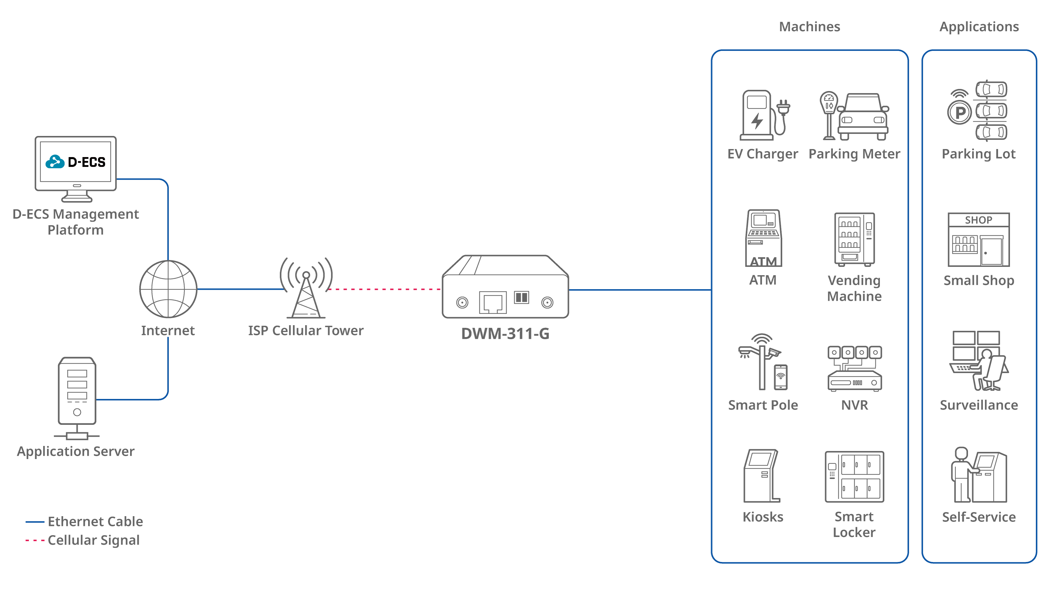 Modem DWM-311-G 5G M2M nabízí jednoduchou integraci se svými 4G/5G celulárními a ethernetovými rozhraními a poskytuje okamžitý přístup bez ovladače pro zařízení s podporou Ethernetu bez nutnosti předkonfigurace nebo speciálního softwaru. Díky této skutečné schopnosti plug-and-play je ideální pro všestranné aplikace. Rozšiřuje kabelovou konektivitu na mnoho zařízení, jako jsou nabíječky elektromobilů, parkovací automaty, bankomaty, prodejní automaty, chytré sloupy, NVR, kiosky a chytré skříňky, což zajišťuje, že je lze snadno integrovat do různých nastavení, včetně parkovišť, maloobchodních prodejen, sledovacích systémů a samoobslužných stanic. Pro přizpůsobené konfigurace je webové rozhraní zařízení uživatelsky přívětivé a snadno nastavitelné prostřednictvím libovolného standardního webového prohlížeče.