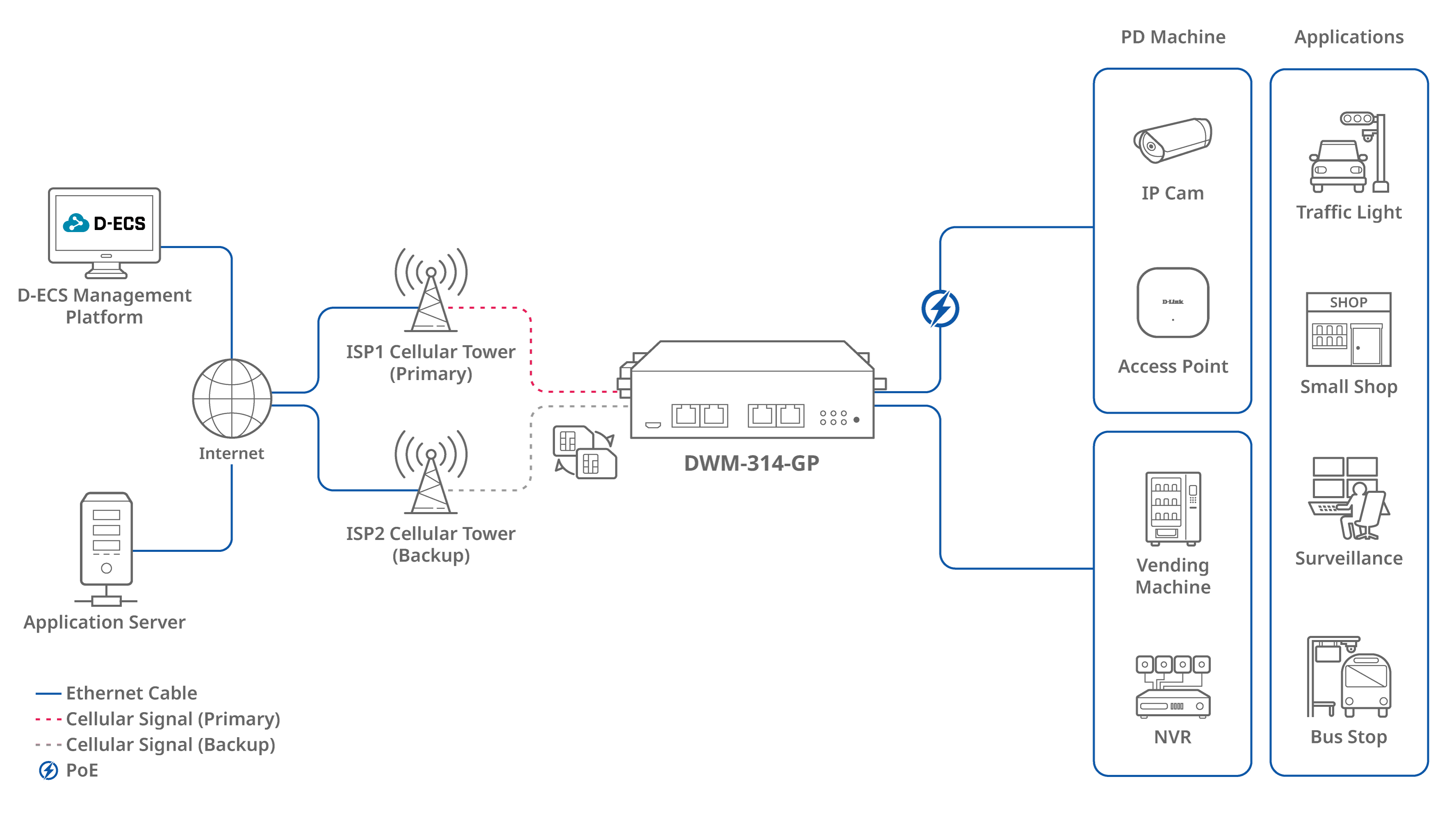 Řada DWM PoE modemů, obsahující vestavěný 4portový gigabitový přepínač a technologii 802.3af/at Power over Ethernet (PoE+), dodává data i napájení prostřednictvím ethernetových kabelů. Jako skutečné řešení PSE (Power Sourcing Equipment) zefektivňuje komunikaci M2M pro aplikace IoT, snižuje potřebu samostatné elektrické infrastruktury a snižuje náklady na instalaci dalšího přepínače PoE. Ideální pro napájení sledovacích kamer, digital signage, bezdrátových přístupových bodů a IoT senzorů, nabízí flexibilní umístění zařízení bez dodatečné kabeláže. Jeho funkce PD-Alive minimalizuje prostoje a zajišťuje nepřetržitý provoz, zatímco plánování PoE optimalizuje spotřebu energie a snižuje náklady na energii.
