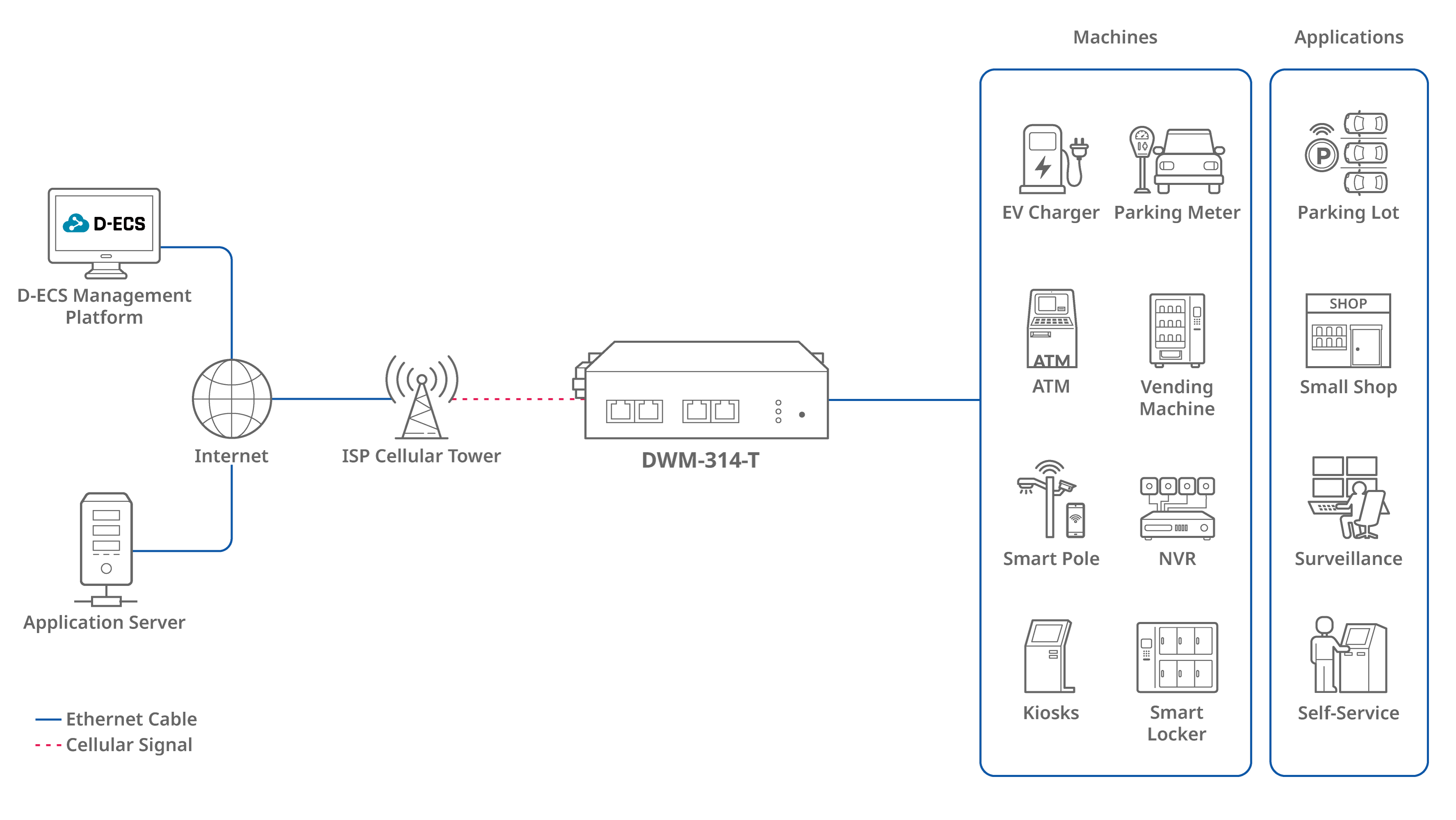 DWM-314-T 4G Multi-Connect Modem nabízí okamžitý přístup díky svým 4G LTE a Ethernet rozhraním a poskytuje skutečný plug-and-play zážitek, který je ideální pro všestranné aplikace. Tento modem poskytuje kabelové připojení k téměř jakémukoli zařízení, od nabíječek elektromobilů a parkovacích automatů po bankomaty, prodejní automaty, chytré sloupy, NVR, kiosky a chytré skříňky. Je ideální pro integraci do různých prostředí, jako jsou parkoviště, maloobchodní prodejny, sledovací systémy a samoobslužné stanice. Pro vlastní konfigurace umožňuje uživatelsky přívětivé webové rozhraní snadné úpravy pomocí libovolného webového prohlížeče.