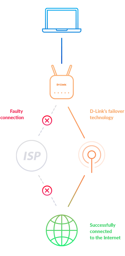 Když vaše 5G/LTE připojení přestane fungovat, zůstanete připojeni k pevnému internetu (optika, kabel, DSL) díky technologii "Failover" společnosti D-Link.