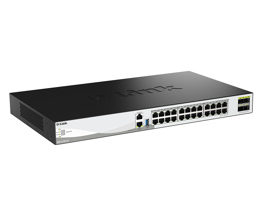 Scale your network with the DXS-3130-28 by stacking up to 9 switches into a single physical or virtual unit. This simplifies management, improves redundancy, and allows control of the entire stack through one IP address. With up to 200 Gbps, physical stacking boosts capacity to meet growing network demands.