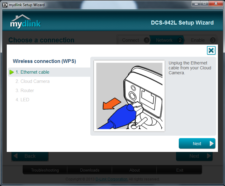 Krok 6: (Připojení kabelem): vyberte jakým běžným způsobem chcete Vaši kameru DCS-932L připojit k routeru. Můžete zvolit připojení pomocí kabelové sítě Ethernet (Ethernetový kabel), výběrem dostupné bezdrátové sítě, nebo pomocí WPS (Wi-Fi Protected Stup).