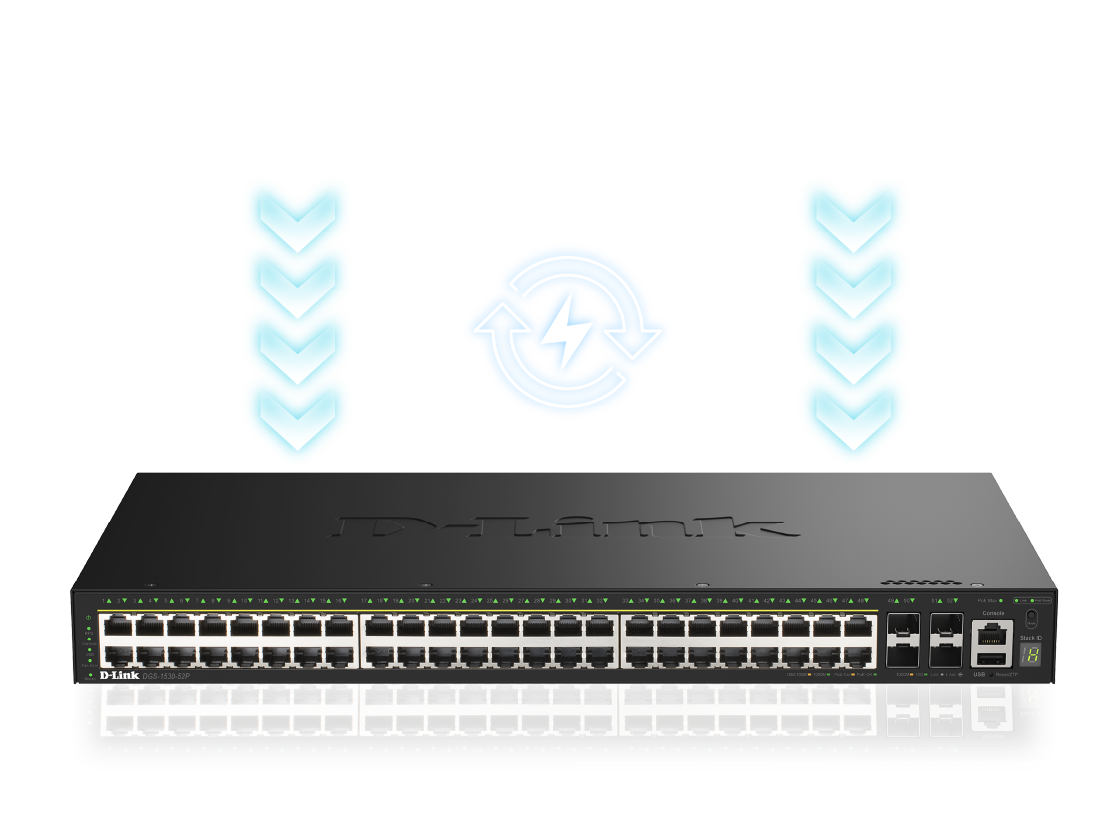 The DGS-1530-52P delivers up to 30 W per port with support for Perpetual and Fast PoE, offering a 370 W PoE budget, expandable to 740 W with the DPS-700 RPS. It powers APs, IP cameras, and VoIP phones over standard Ethernet—simplifying deployment and allowing easy planning of power resources across your network.