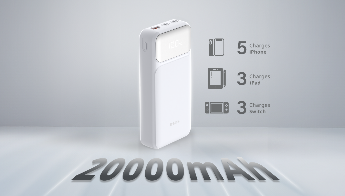The D-Link DPP-201 is a compact yet powerful solution for all your charging needs. With a high 20000mAh capacity, it keeps your devices running longer, whether you’re traveling, working remotely, or on the move. The DPP-201 can top up an iPhone X 5 times, an iPad mini 3 times, or a Nintendo Switch 3 times.*