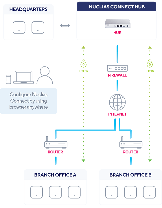 Centralised configurations allow network expansion of up to 100 APs/switches per Hub which results in a lower total cost of ownership.