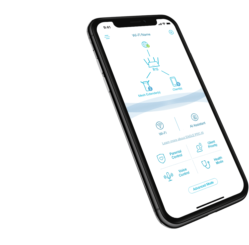 The EAGLE PRO AI App streamlines functionality and simplifies manageability for your EAGLE PRO AI devices to revolutionize your home Wi-Fi network. Advanced capabilities such as AI Mesh, Wi-Fi, and Traffic Optimizers help keep your home Wi-Fi at peak performance, while AI Assistant and AI Parental Control give you effortless Wi-Fi manageability for a balanced and healthy lifestyle for the entire family.