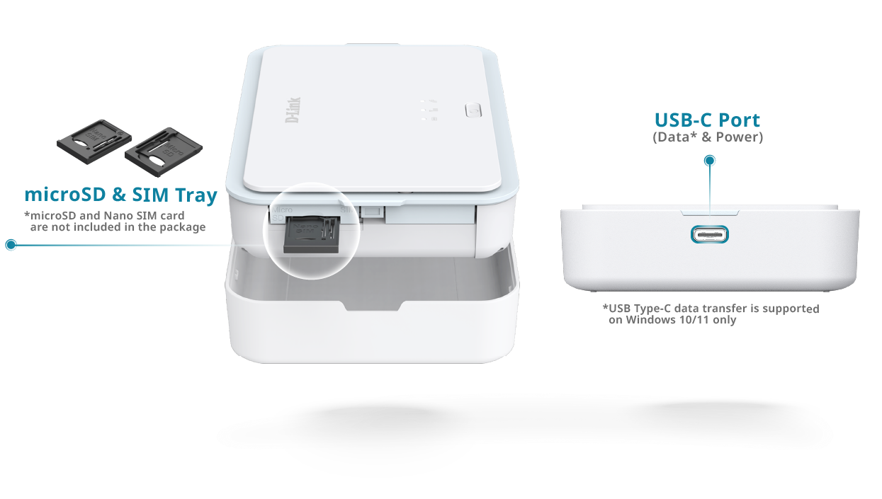 The DBR-330-G adapts to your needs with a Nano SIM card slot for instant mobile broadband, a microSD card slot supporting up to 2TB for easy backup and file sharing, and a USB-C Port (Data & Power) for convenient charging and efficient data transfer, all in a compact, pocket-size design that goes wherever you do.