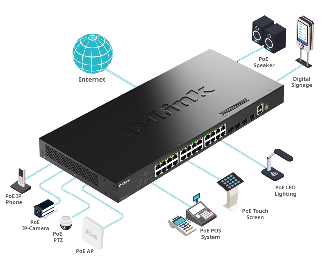 PoE enables the simple deployment of IP cameras, APs, and VoIP phones over standard Ethernet, reducing the need for separate electrical wiring and allowing owners to tailor power availability for their business venues.
