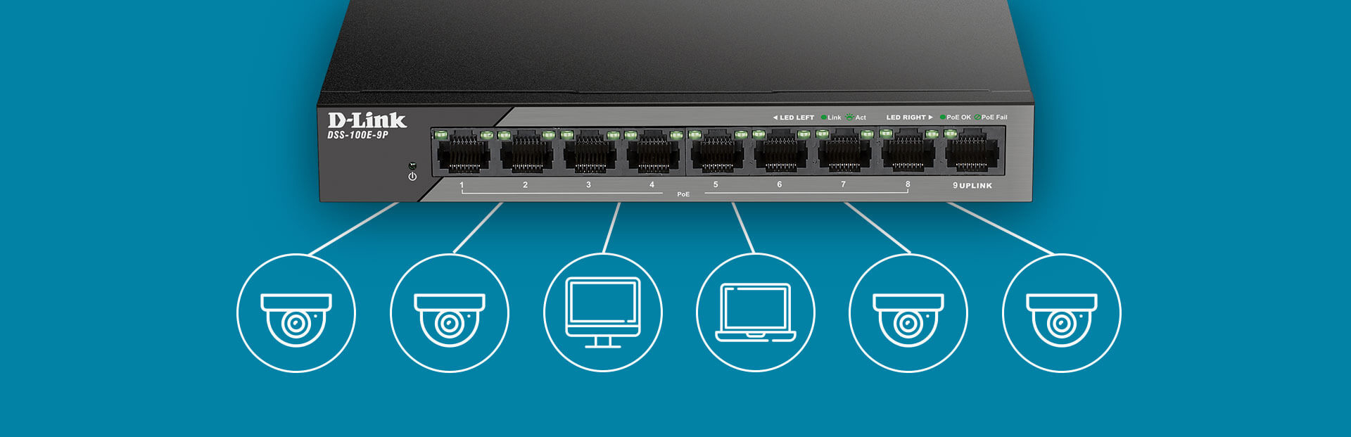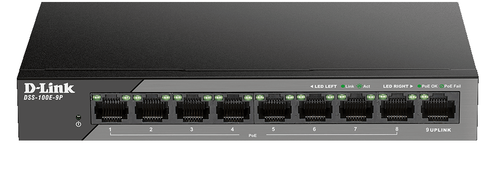 The DSS-100E-9P comes with powerful PoE capabilities. Able to supply up to 30W per port with a total power budget of 230W to devices up to 250m away, it can be the heart of your surveillance setup. Simply connect your PoE supported devices and you’ve got a capable surveillance network with minimal wiring required. Finally, its Gigabit uplink provides ample bandwidth. This ensures smooth transmission of footage when connecting to a Network Video Recorder (NVR) or core switch.