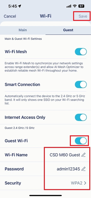 Step 5: Enable Guest Wi-Fi, and then configure the SSID/password/Security. Then, tap Save to save the settings. You can now share the Guest Wi-Fi network with your visitors.