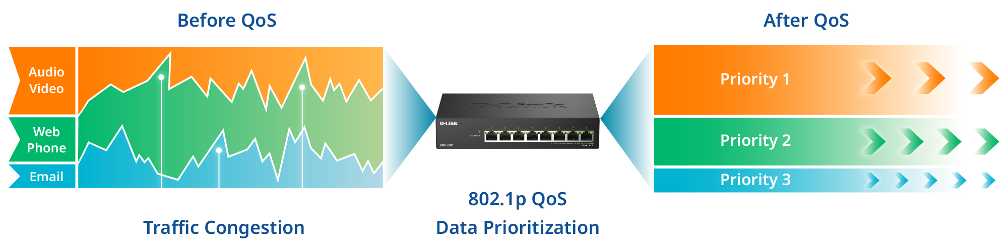 With the DMS-108P, you can effortlessly manage your network traffic with the 802.1p Quality of Service (QoS) feature. The switch automatically organizes and prioritizes time-sensitive and critical data for efficient delivery, enabling buffer-free video streaming as well as jitter-free video and voice calls.