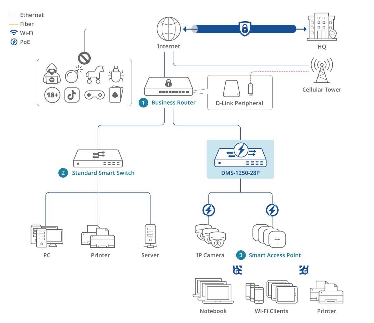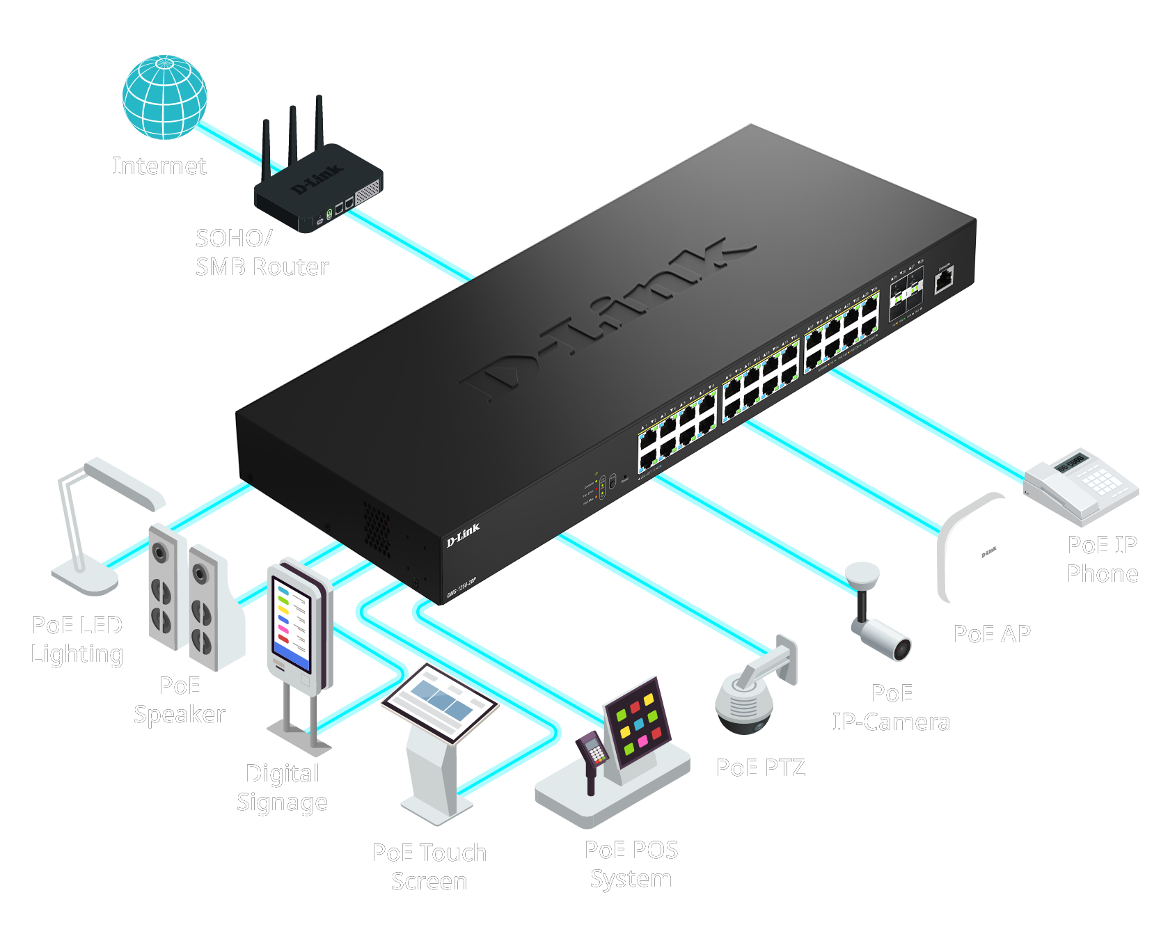 The DMS-1250 Series switches elevate your network with 2.5 Gbps ports, optimized for Wi-Fi 6 access points to maximize throughput and speed. Multi-Gigabit Ethernet eliminates bottlenecks, fully utilizing Wi-Fi 6’s high performance.