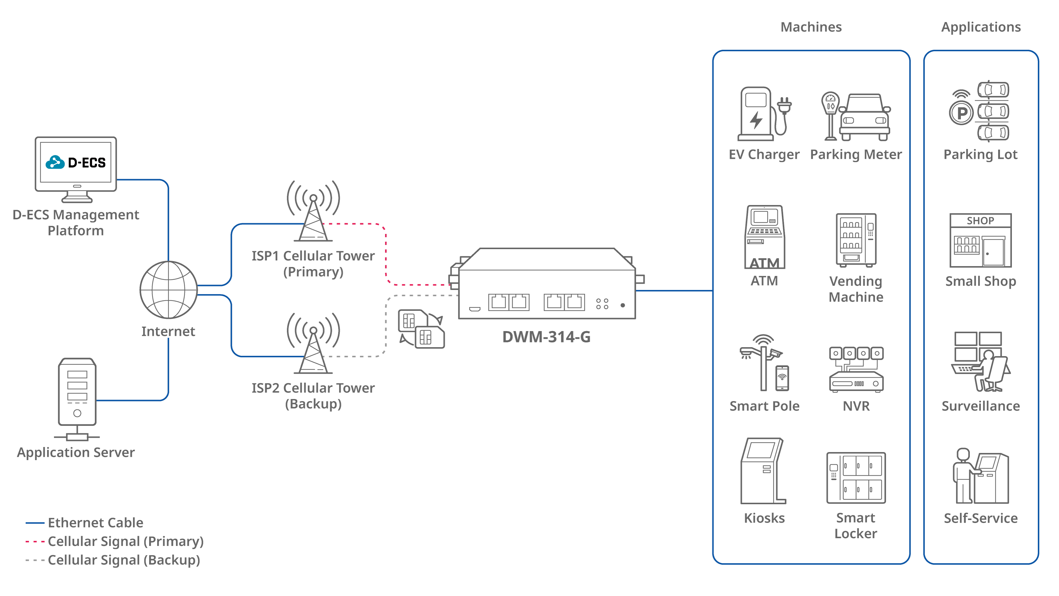 The DWM-314-G 5G Multi-Connect Modem offers effortless integration with its 4G/5G Cellular and Ethernet interfaces, providing instant, access for Ethernet-enabled devices without any need for pre-configuration or special software. This plug-and-play capability makes it ideal for versatile applications. It extends wired connectivity to many devices, like EV chargers, parking meters, ATMs, vending machines, smart poles, NVRs, kiosks, and smart lockers, ensuring it can be easily integrated into diverse settings including parking lots, retail shops, surveillance systems, and self-service stations. For tailored configurations, the device's web interface is user-friendly and readily adjustable through any standard web browser.