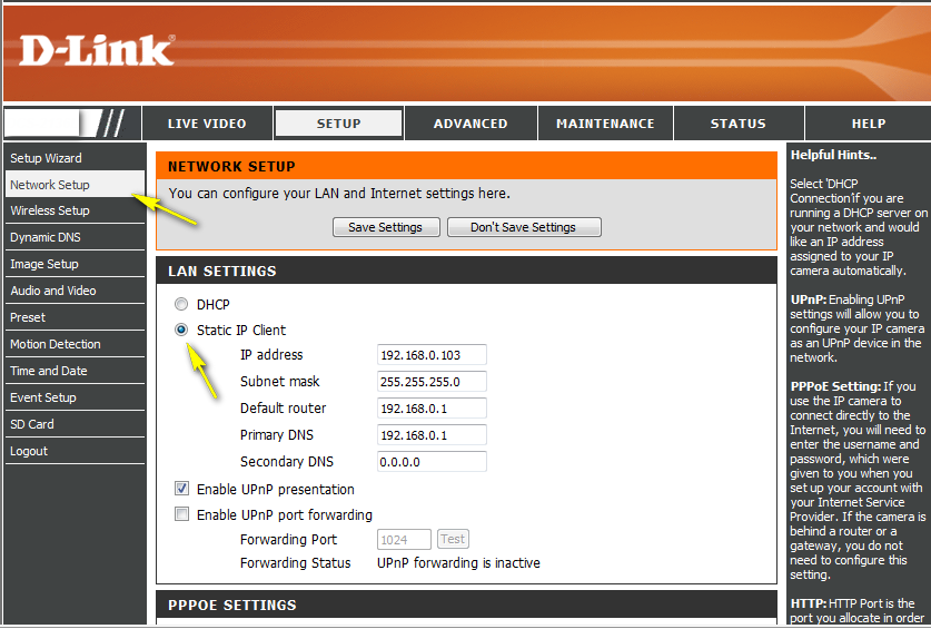 Step 4: Select Network Setup from the menu on the left hand side of the page, and select the Static IP Address radio button.