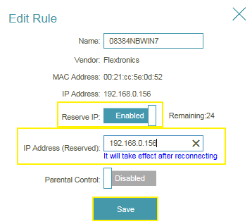 Step 3: Click Reserve IP to Enable, and fill in the reserved IP address, then click Save.