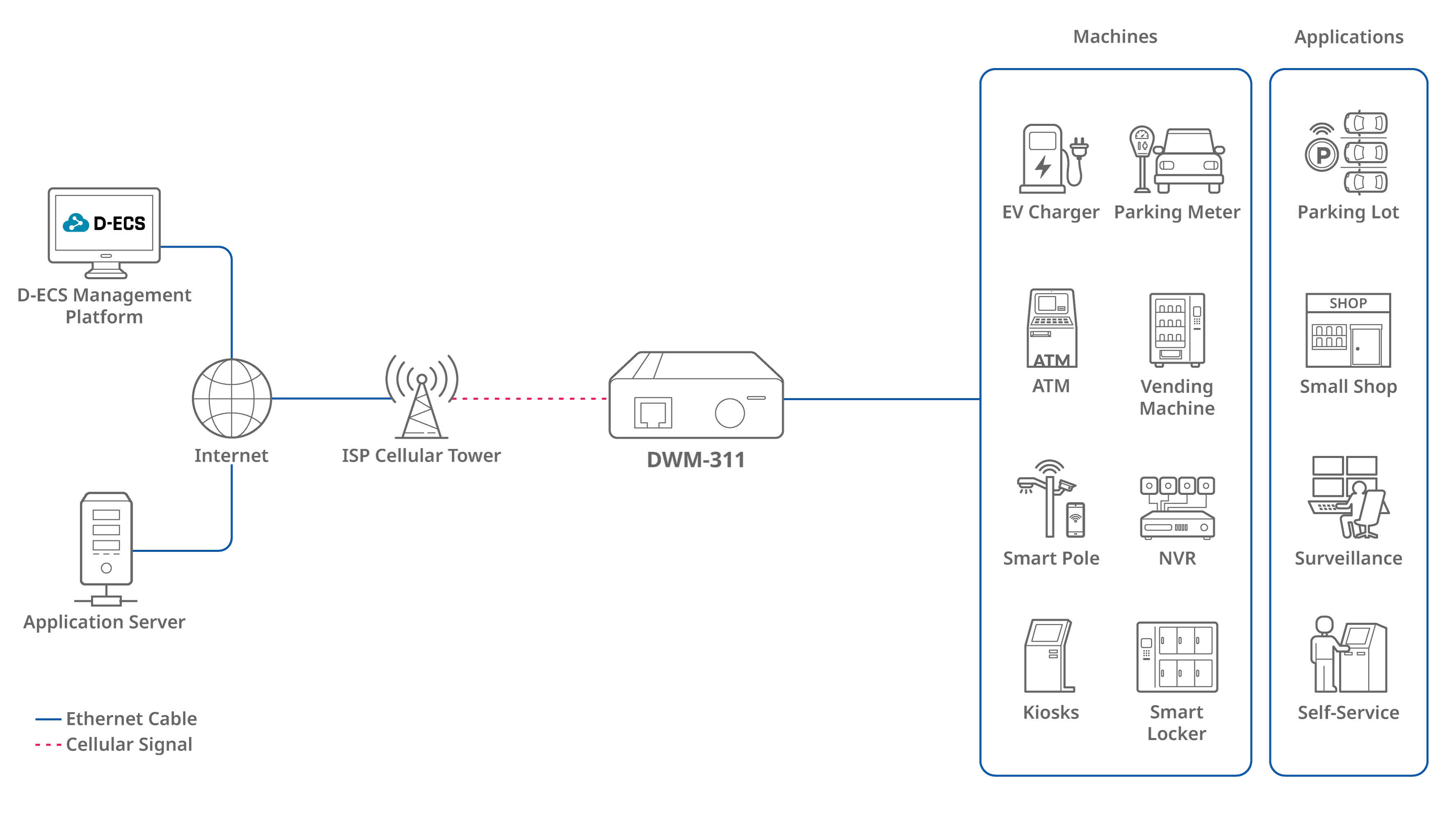 The DWM-311 4G M2M Modem offers instant access with its 4G LTE and Ethernet interfaces, providing a plug-and-play solution for versatile applications. This modem grants wired connectivity to many devices, from EV chargers and parking meters to ATMs, vending machines, smart poles, NVRs, kiosks, and smart lockers. It integrates seamlessly into environments like parking lots, retail shops, surveillance systems, and self-service stations. For custom configurations, the user-friendly web interface allows easy adjustments via any web browser.