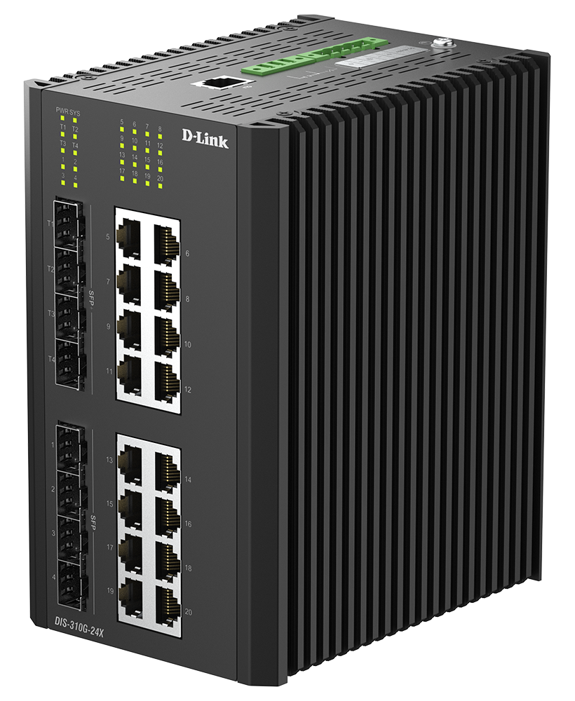 The DIS-310G-24X is an industrial managed switch featuring sixteen 1GE ports, four 1G SFP ports, and four 10G SFP+ uplinks for high-performance aggregation and network backbone connectivity. The SFP interfaces support long-distance transmission, rapid failover, and high-capacity traffic aggregation, while built-in Layer 3 management with static and dynamic routing enables efficient traffic control and scalable network design.