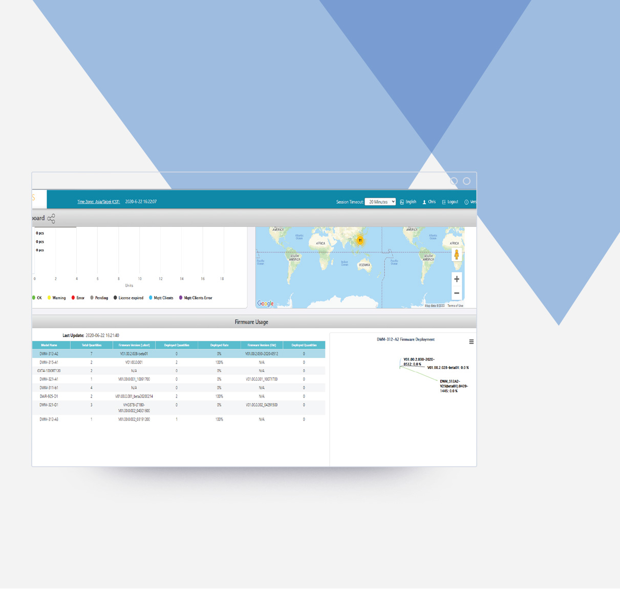 D-ECS offre une vue d’ensemble complète de l’infrastructure réseau en un coup d'œil avec la surveillance et des rapports d’état en temps réel. Tous les emplacements des périphériques de pointe sont affichés de manière pratique sur un affichage Google Maps intégré.