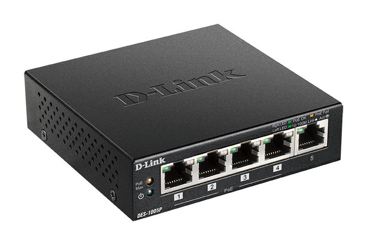 4 ports du switch DES-1005P reconnaît la norme PoE IEEE 802.3at. Ces ports PoE délivre jusqu'à 30 watts et détecte automatiquement la puissance nécessaire pour le périphérique PoE connecté ; aucune configuration n'est donc requise. Cela fait du DES-1005P une solution très pratique pour les applications éloignées de prises de courant, ou lorsqu'il est nécessaire de réduire l'encombrement dû à des alimentations électriques supplémentaires.
