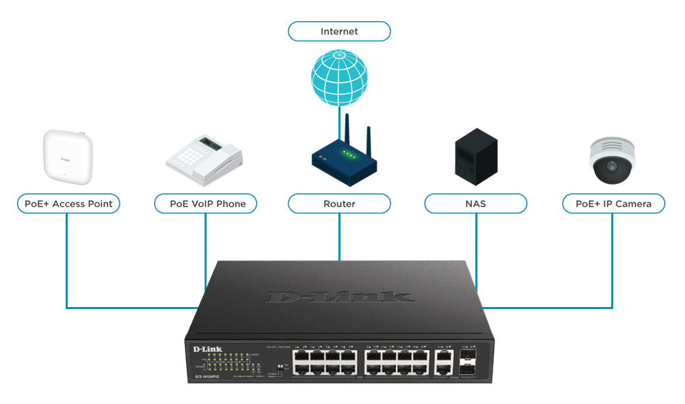 The DES-1018MPV2 is specifically designed to facilitate easy connections and supply of power to devices such as access points (AP) or IP cameras and phones. But that’s not all, connect other Ethernet devices such as computers, printers and NASs to unify all your devices under one efficient network ready for any application.