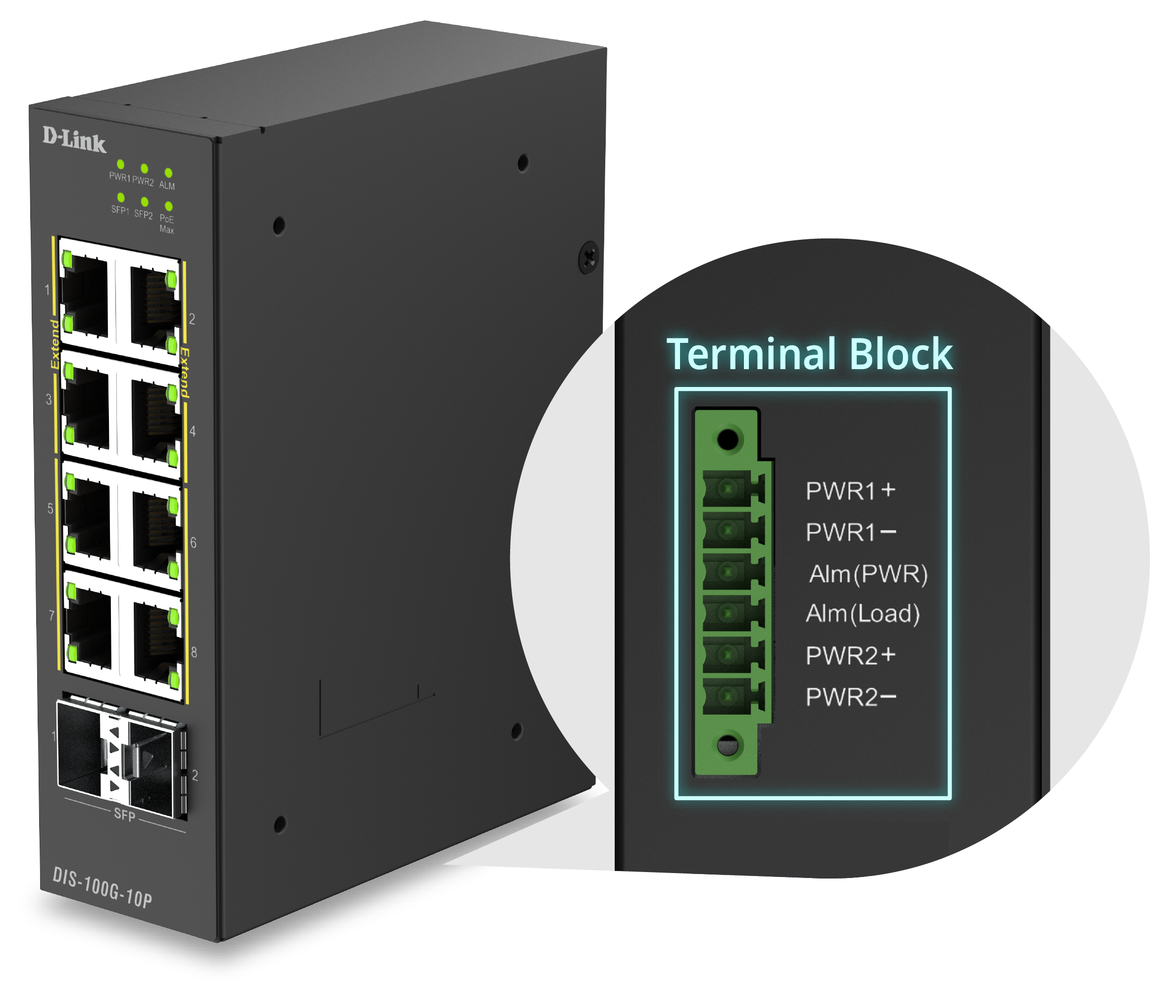 The DIS-100G-10P features two SFP ports that enable flexible, long-distance fiber connections, perfect for extending your network across remote sites or between buildings. Fiber optic cabling goes beyond the distance limitations of traditional Ethernet, offering high bandwidth and strong resistance to interference. This ensures stable, high-performance transmission in industrial environments where reliability is essential.