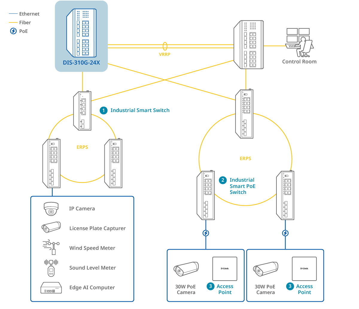 The DIS-310G-24X supports ERPS v1 and v2, enabling multiple ring topologies that prevent network loops while providing redundant paths for continuous connectivity. This ensures high network resilience, fast failover, and easy scalability.