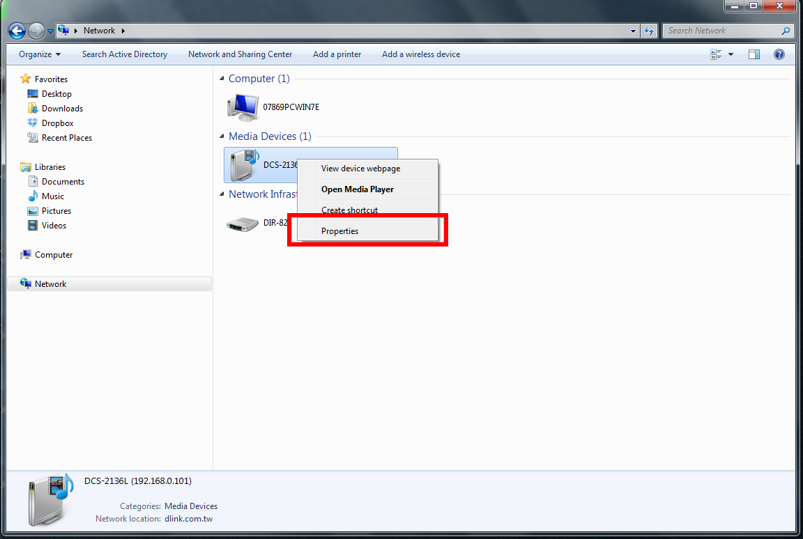 Step 3: Under the Media Devices section, locate the DCS-6004L and right-click on the icon. Select Properties from the pop-up menu.