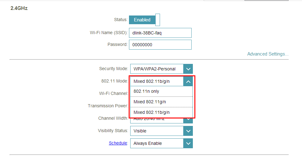 Example: If your device only supports 802.11b or 802.11g and it can’t connect to the router then you can try to change the 802.11 mode to solve the problem. If your devices all use the same 802.11 standard, you can set an ‘only’ mode to improve performance.