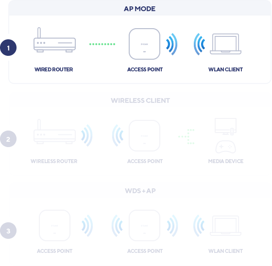 Use as an access point (AP), wireless client, Wireless Distribution System (WDS) or Wireless Distribution System with AP (WDS+AP).