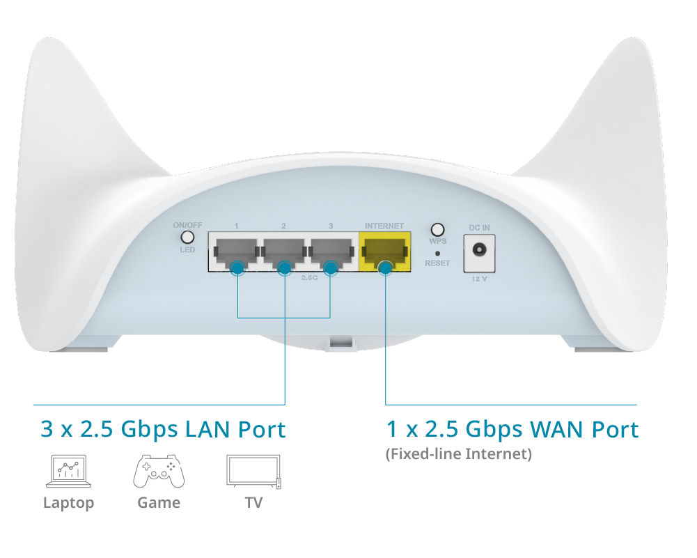 3 x 2.5 Gigabit Ethernet LAN ports 1 x 2.5 Gigabit Ethernet WAN port 1 x WPS button 1 x reset button 1 x power connector 1 x LED on/off |