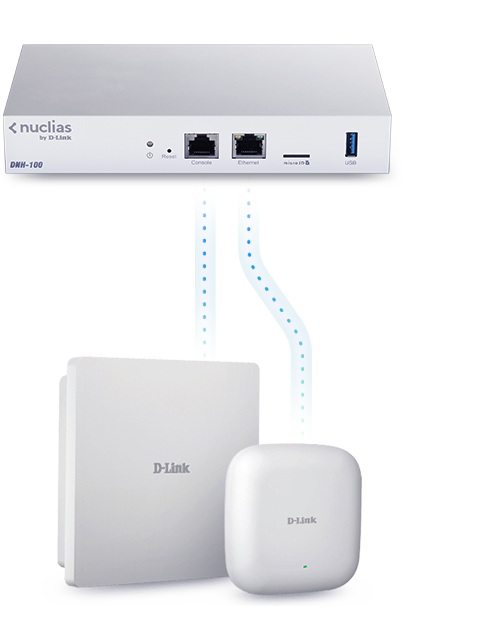 The DNH-100 Wireless Controller provides an inexpensive, ready-made solution, and removes the need for installing and maintaining Nuclias Connect on additional hardware such as a server or PC. It supports up to 100 APs, automatically detects devices, pushes configurations, and provides robust hardware management. Simply plug in and power on.