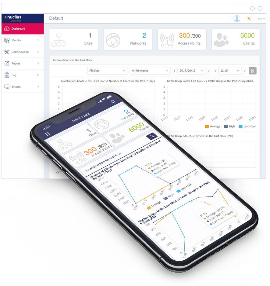 Nuclias Connect enables you to manage and control your network from anywhere with an Internet connection. It provides an extensive understanding of your network and its users through traffic analytics and status reports, which can be viewed at a glance through the intuitive interface via a browser or the app. Insights derived from this traffic data can be used to create business value, and traffic can be viewed across the entire network, and to the level of a single AP.