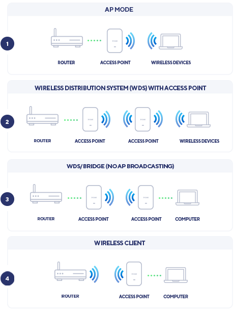 Access Point (AP) WDS bridge WDS with AP Wireless client |