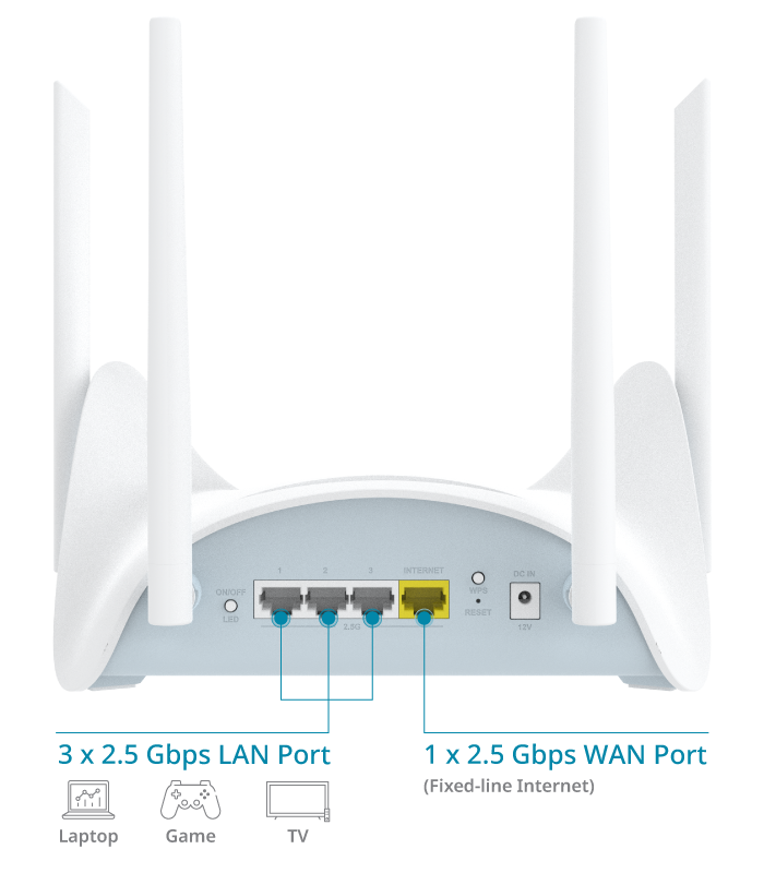3 x 2.5 Gigabit Ethernet LAN ports 1 x 2.5 Gigabit Ethernet WAN port 1 x reset button 1 x power connector 1 x LED on/off |
