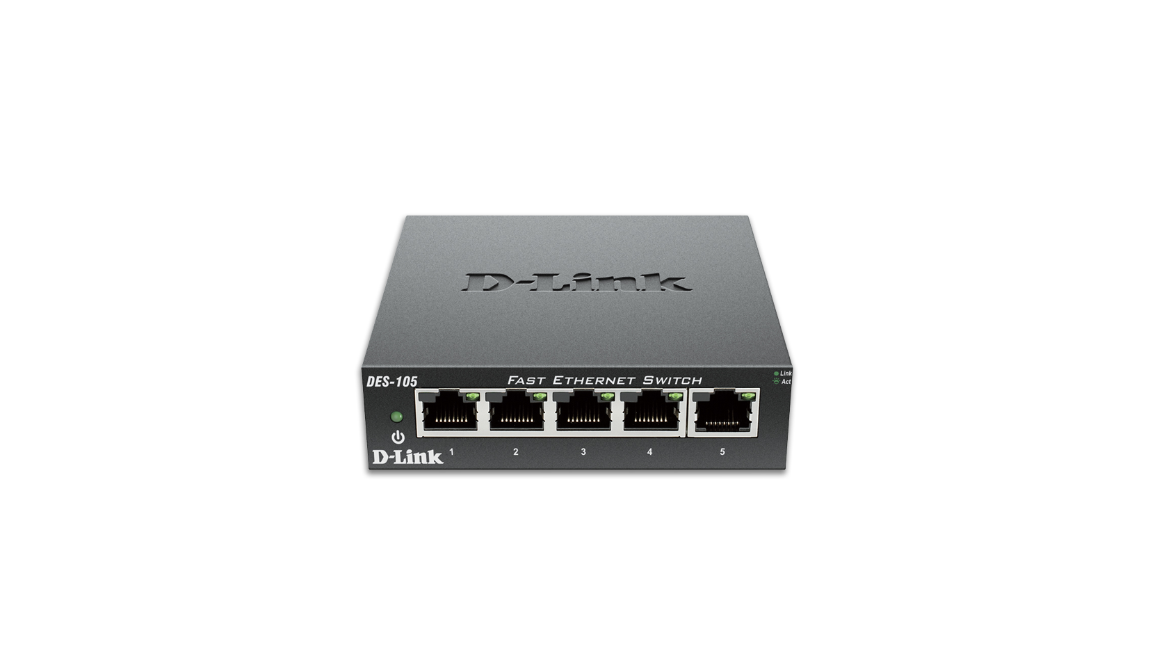 The DES-105 5-Port Fast Ethernet Unmanaged Desktop Switch is a 5-port 10/100 Mbps Fast Ethernet switch that allows you to quickly set up a wired network. Connect the DES-105 to multiple computers together to share files and folders, or connect it to a router to share an Internet connection.