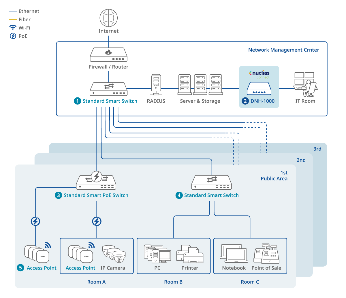 With the DNH Nuclias Network Controller series, you can easily centralize the management of D-Link's AP and switches , offering more convenient and graphical interface-based centralized monitoring.
