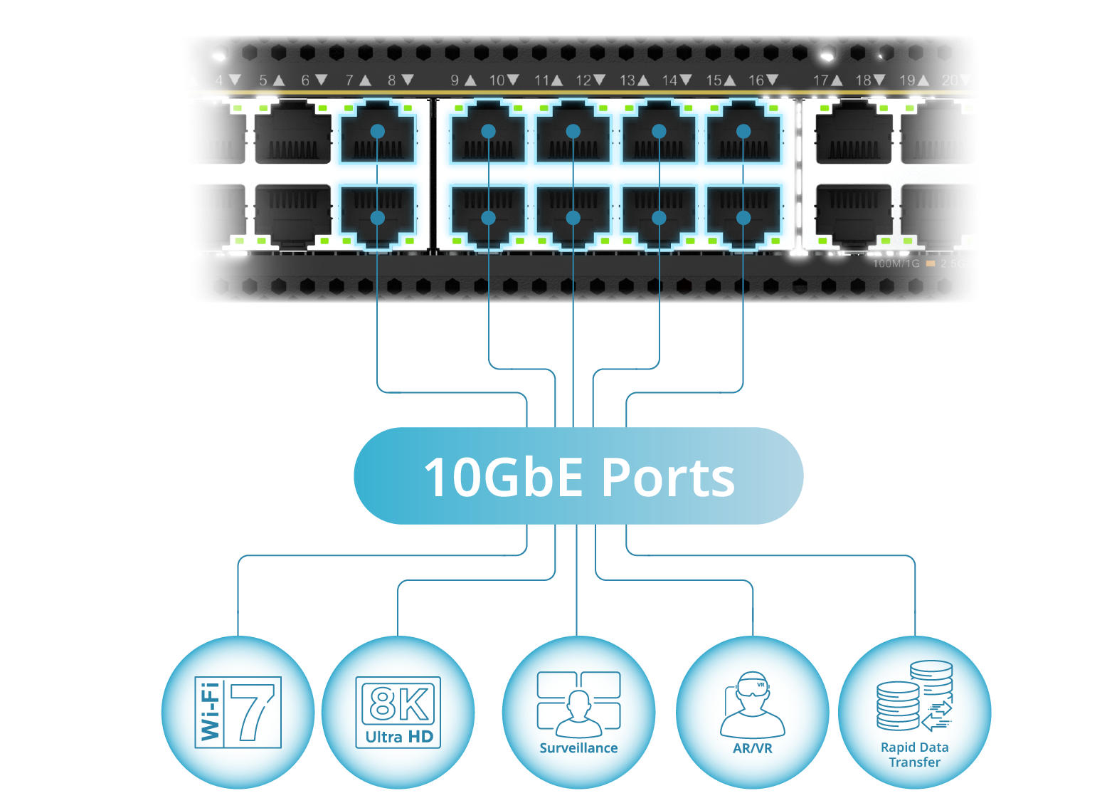 Wi-Fi 7 offers ultra-fast speeds and low latency, but Gigabit Ethernet can bottleneck performance. 10G Ethernet eliminates this, enabling seamless 4K/8K streaming, HD video surveillance, lag-free AR/VR, and rapid data transfers. With 10 Gbps speeds, it delivers fast, reliable, and future-ready connectivity—unlocking Wi-Fi 7’s full potential.