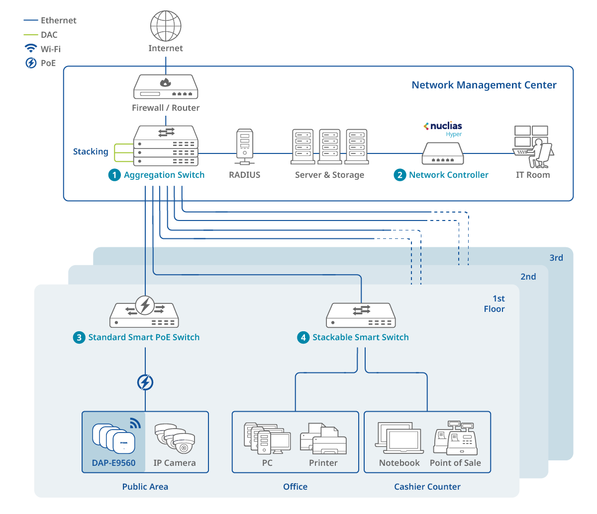 The DAP-E9560 integrates seamlessly with D-Link’s Nuclias Network Controller and software-based management platform, empowering businesses with centralized, remote management capabilities. Accessible from anywhere via an internet connection, this solution enables streamlined network control, automation, and effortless scalability. With built-in analytics and reporting, it delivers actionable insights across your network down to each access point for smarter decision-making.