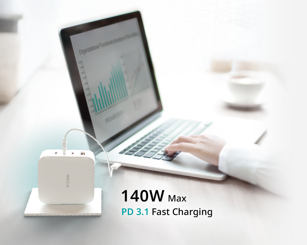 Streamline your home workspace with the D-Link DCF-141. This powerful 140W GaN charger powers a laptop, a tablet, a cell phone, and more simultaneously at full speed. Compact and efficient, it helps you stay focused and fully charged throughout the day, without the clutter of multiple adapters.