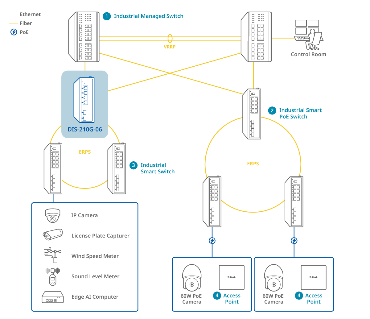 The DIS-210G-06 is an industrial smart switch equipped with four 1G ports and two 1G SFP ports for network management and aggregation. The SFP ports support long-distance data transmission, rapid failover redundancy, and throughput aggregation. The DIS-210G-06 supports ERPS and static routing, which reduces latency, enables effective traffic control, and improves network scalability and efficiency.