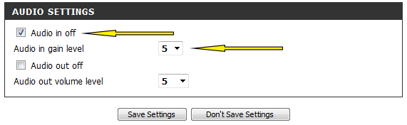 Step 5: To enable the microphone, ensure the Audio in off checkbox is unchecked. To enable the line out ensure the Audio out off checkbox is unchecked. You can adjust the gain for both the audio in (microphone) and audio out using the drop-down menus on the right-hand side of the box. Note: In order to use the audio out function, you must connect a set of external speakers to the camera’s line out jack.