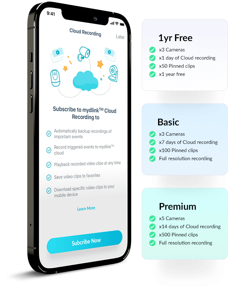 With a mydlink™ Cloud recording subscription, you can have peace of mind that your video recordings are saved automatically to the secure cloud server, so intruders won’t be able to steal footage.